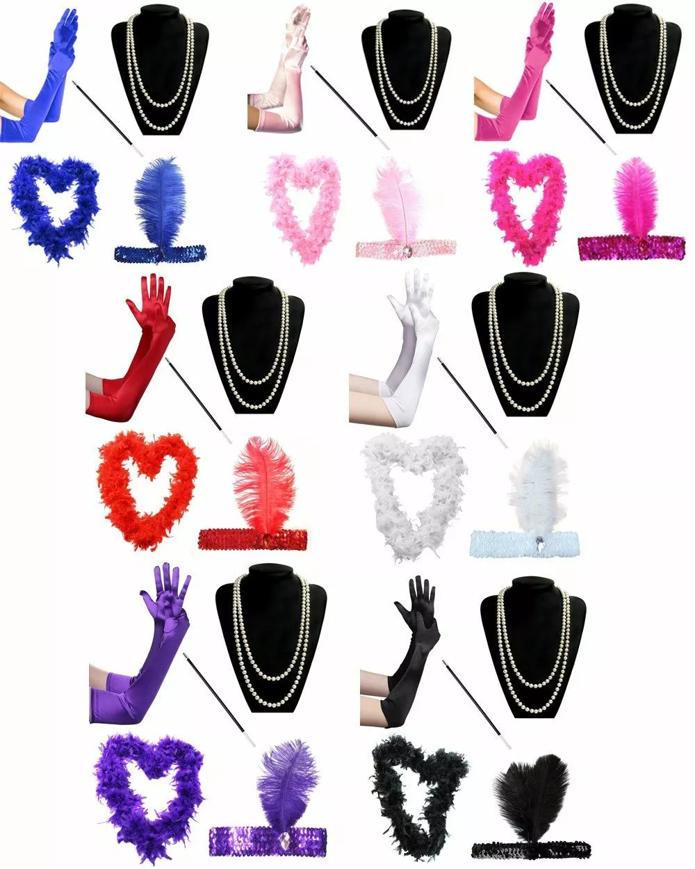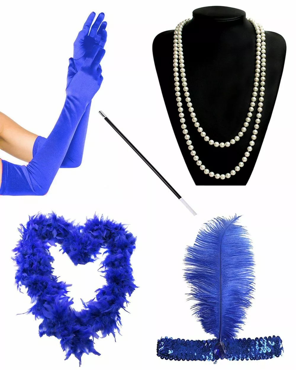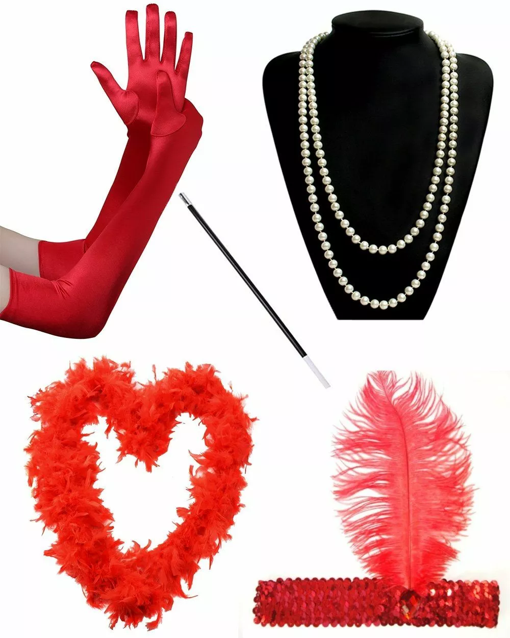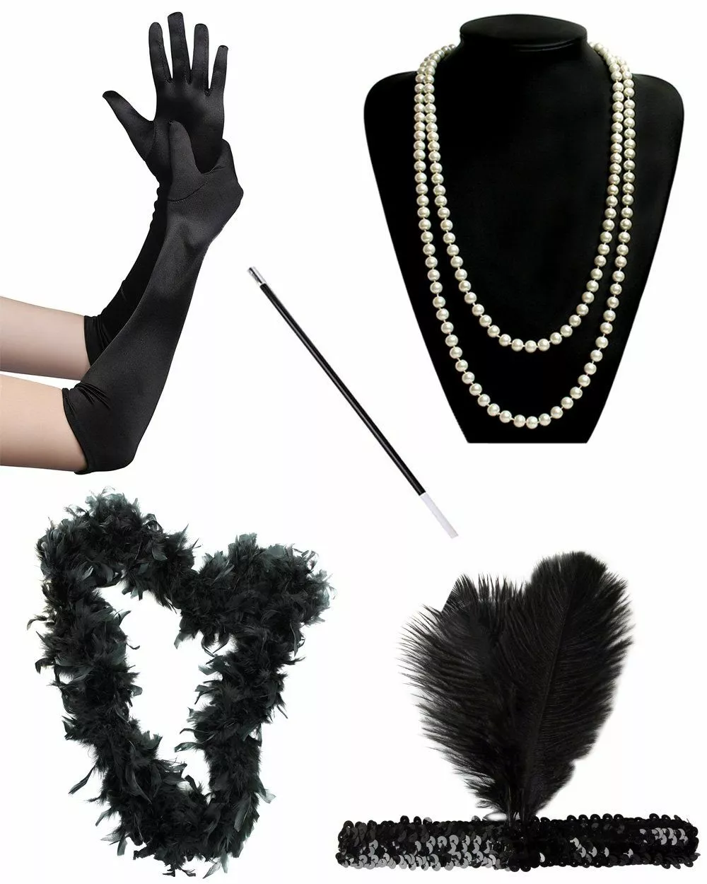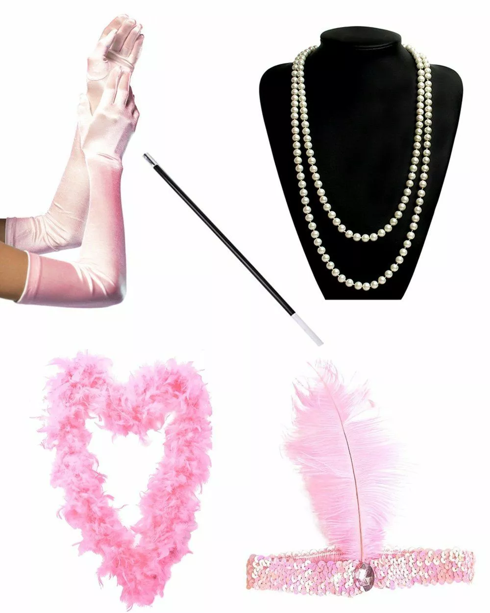 Package includes: Cigarette Holder, Faux Pearl Necklace, Feather Boa, Satin Gloves & Flapper Headband