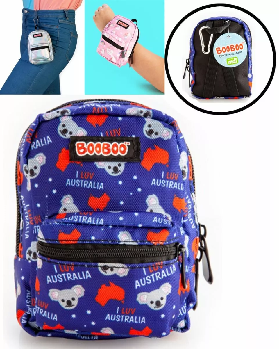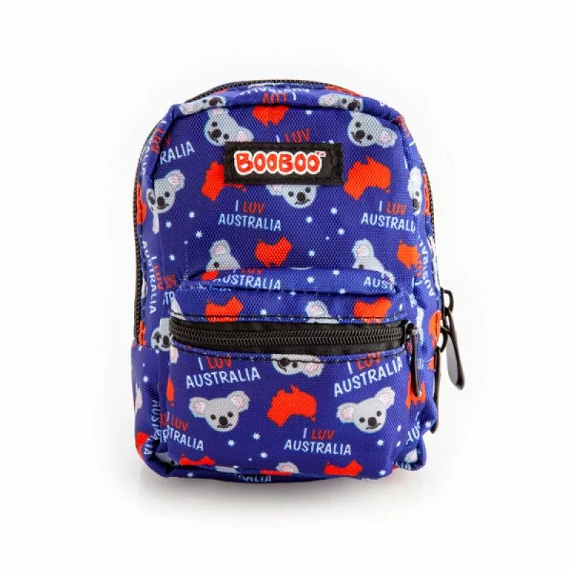 Cute mini backpack featuring koala heads, a map of Australia, and “I luv Australia” text, all in Aussie flag colours