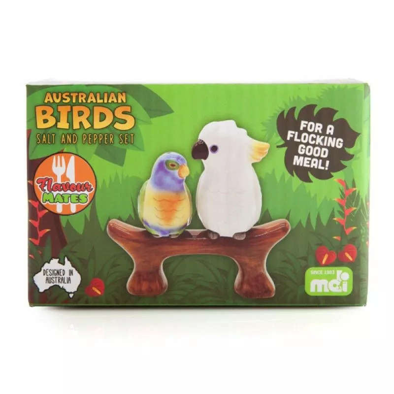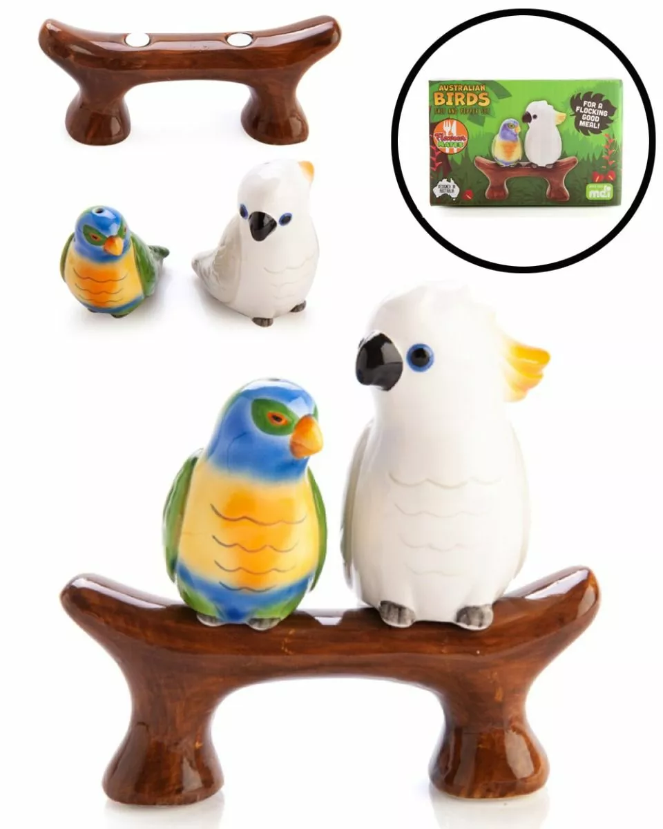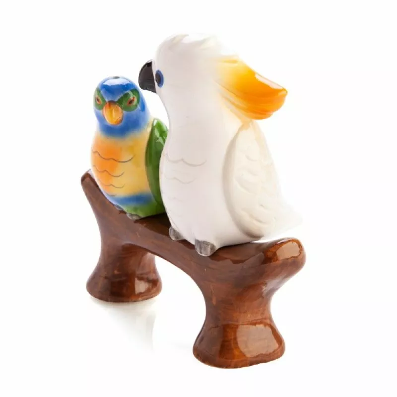 Cute ceramic salt and pepper shakers shaped like a cockatoo and rainbow lorikeet