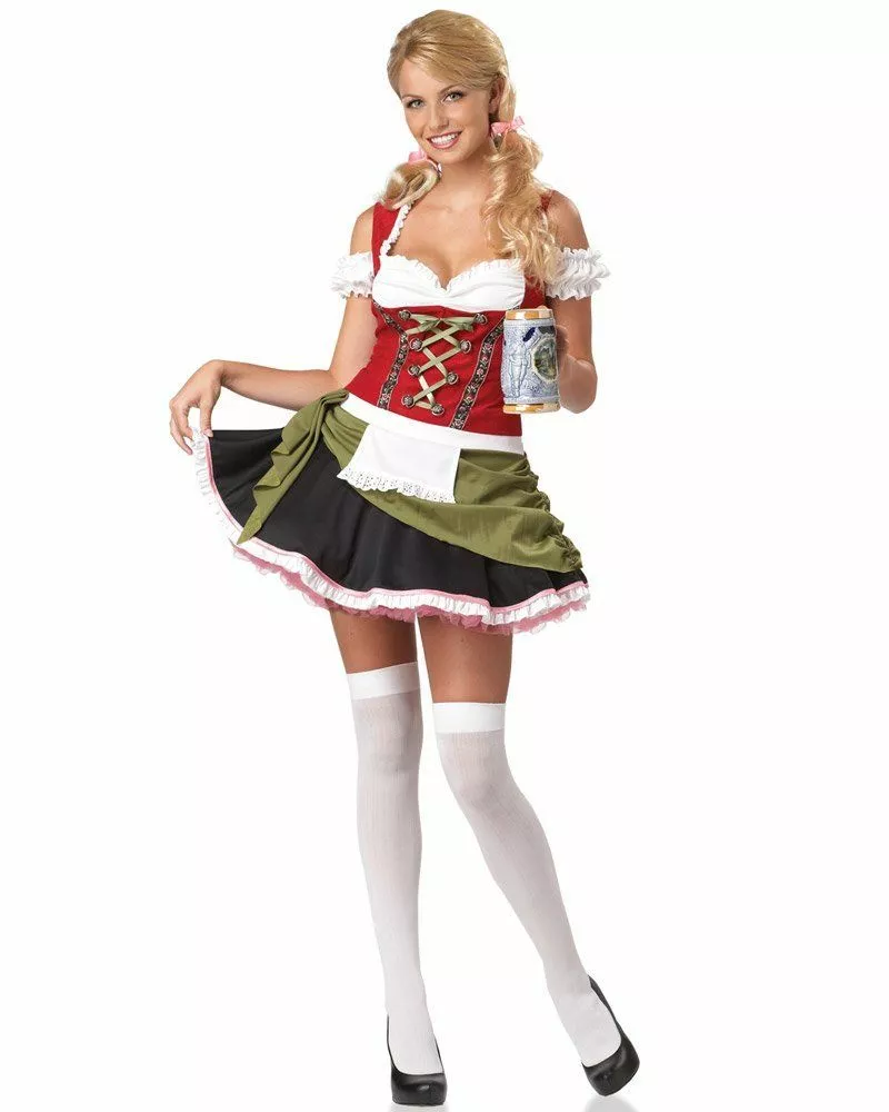 The Bavarian Bar Maid Adult Costume includes an off-the-shoulder, drindl-style dress with lace-up bodice detail. Coordinating hair ties and petticoat are also included in this Alpine-ready ensemble.