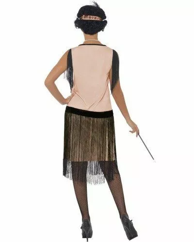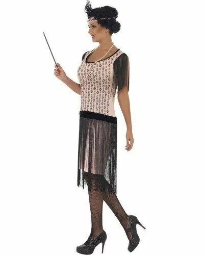 This stunning 1920s Coco Flapper Costume takes inspiration from Coco and features a dusky pink and black dress with black velvet trim to neckline, tassels to shoulders, a drop waistline with velvet trim, detachable pretty, pearl brooch and long draping tassels. Sometimes it’s the little things that make the difference so also included is a cigarette holder, a realistic looking pearl necklace and a black feather along with a beautiful co-ordinating headband with velcro fastening and yet another detachable pearl brooch, the Roaring Twenties were all about becoming “someone” and a certain unique look that was flattering, feminine but most of all fun !