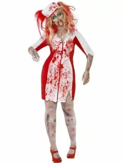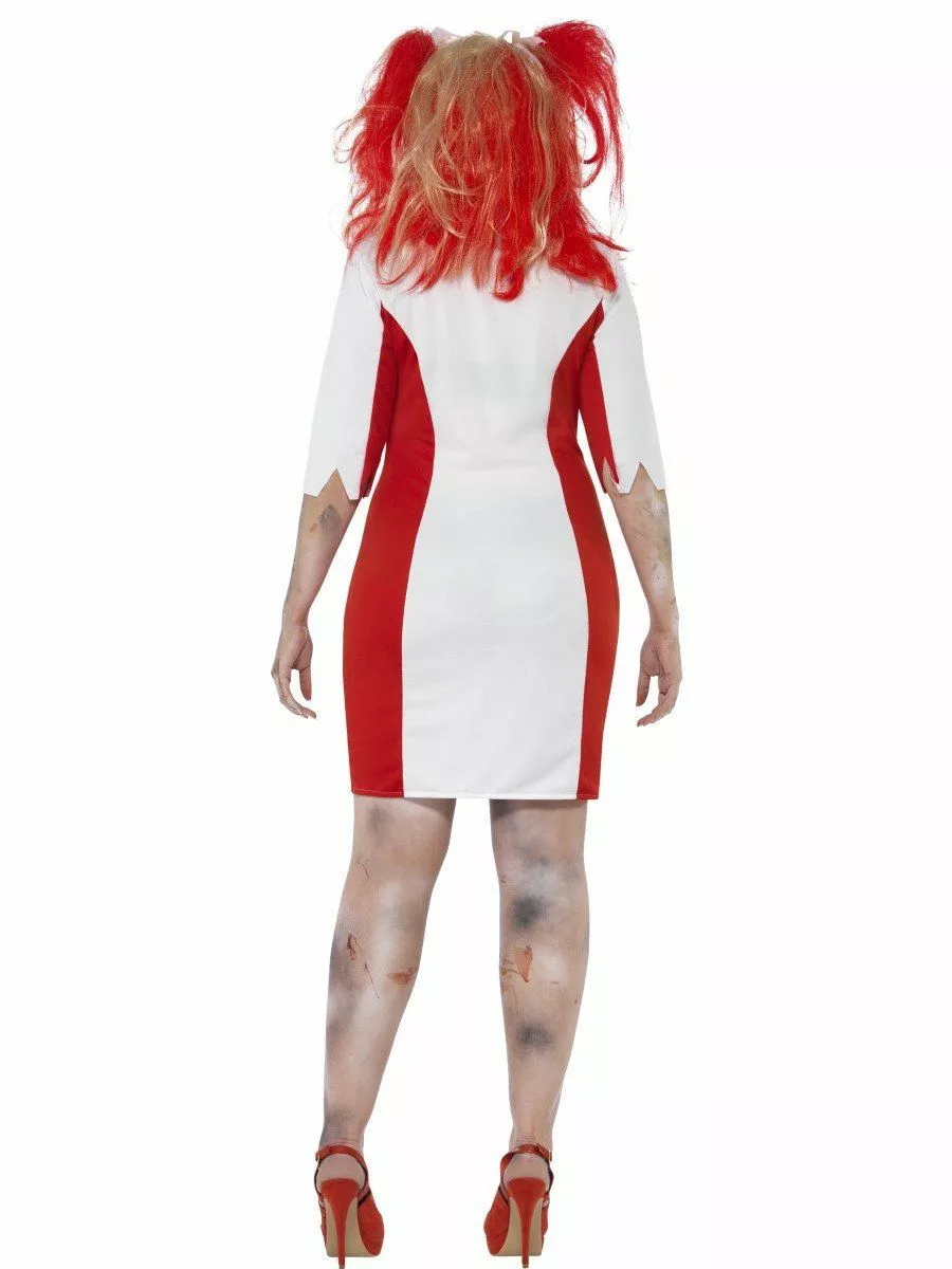 The Costume comes complete with the White Blood Smeared Dress with the Zip Up Front and Tattered Neckline along with the 2 Red Panels that Run from the Bottom of the Sleeves to the Hem of the Dress. The Plus Size Zombie Nurse Costume is completed with the Matching Bloody Headpiece with Hospital Cross in the Centre.