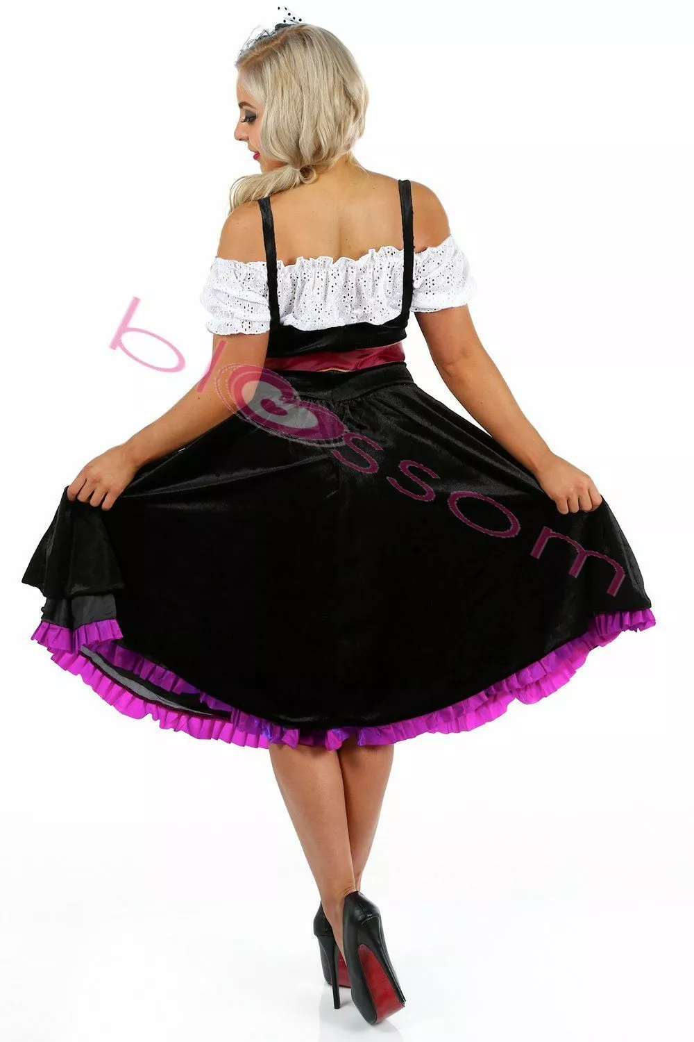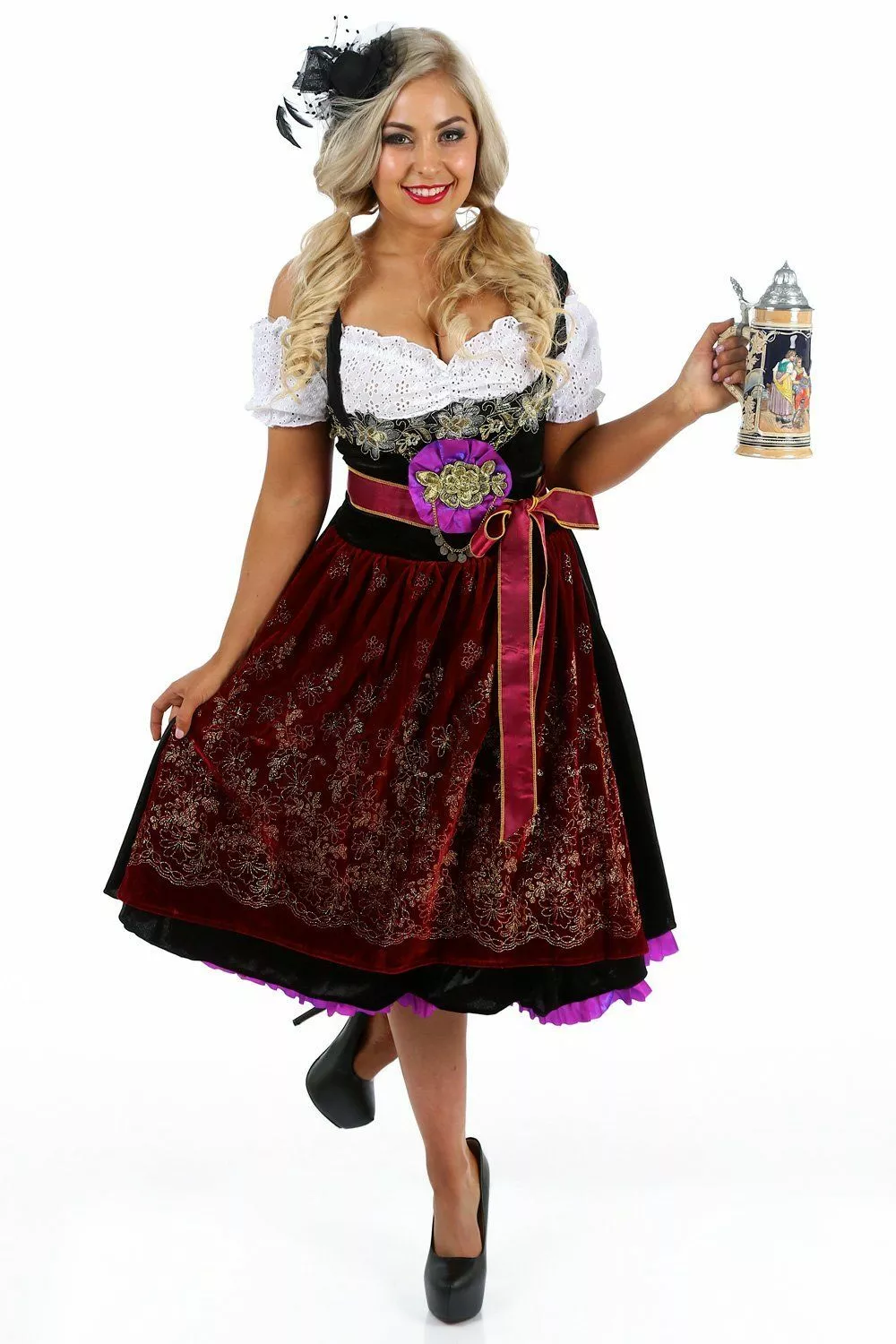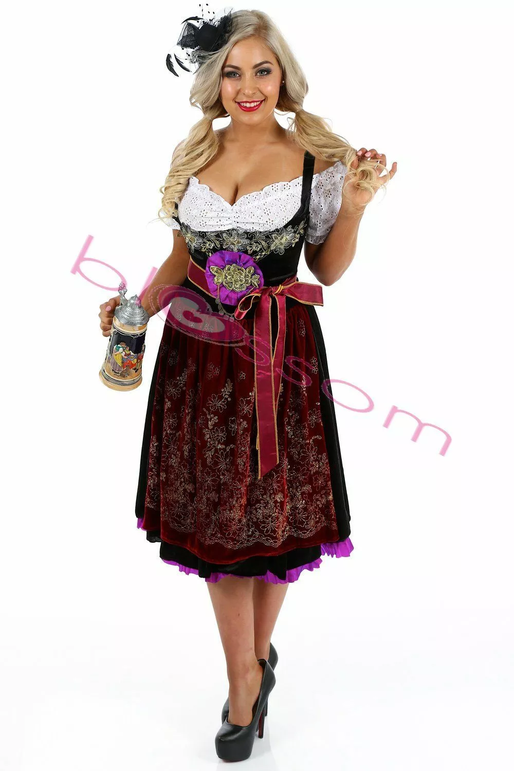 Deluxe Oktoberfest Costume features: a high quality white lace off-the-shoulder top with puff sleeves design, a black and wine-red velvet tea-length dress, with 3D floral trim around bust, purple ruffles hemline, matching waist band.Â