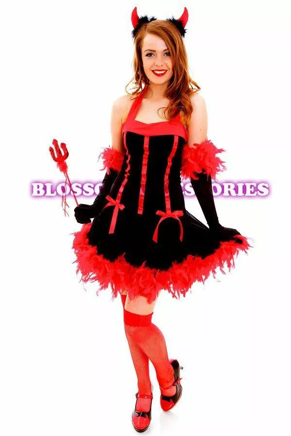 Our halter-style dress comes with a built-in petticoat and a feathered hem. Slip on the accompanying black gloves – also fabulously feathered – along with the devil-horns headband, and your costume is coming together.