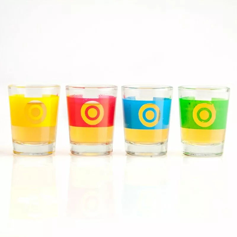 Set includes: 1 magnetic dart board, 4 magnetic darts and 4 shot glasses