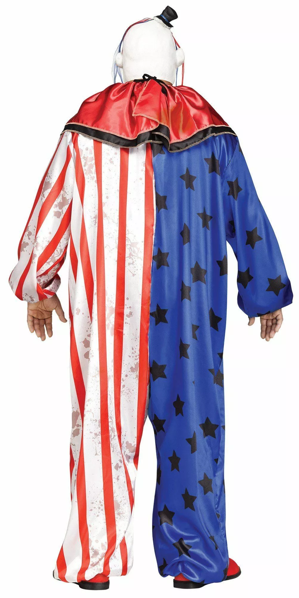 Our men’s Evil Clown Costume includes a red, white and blue jumpsuit with printed stars and stripes, red ruffle collar with black trim and a scary clown mask with attached mini hat and stringy hair.