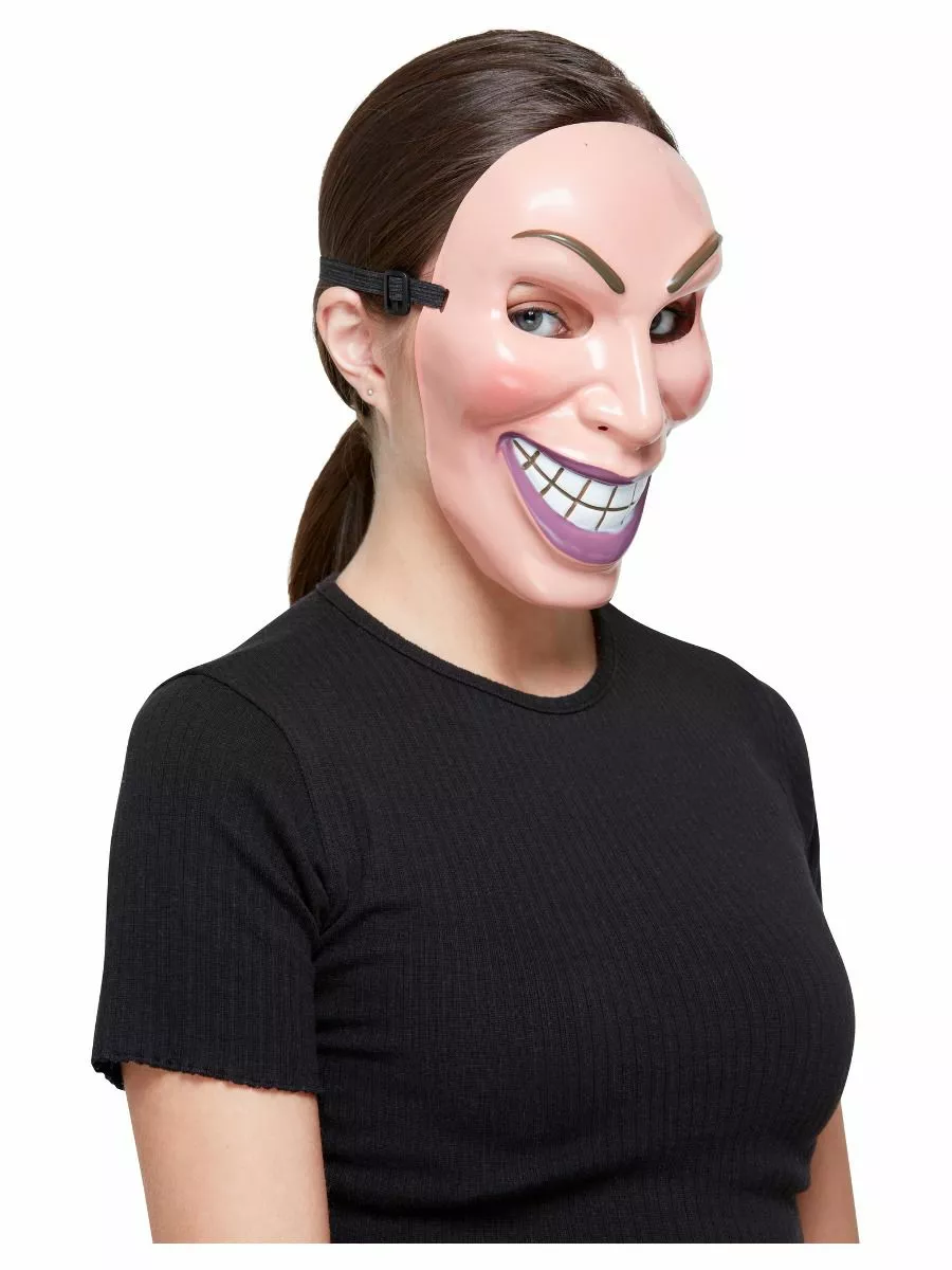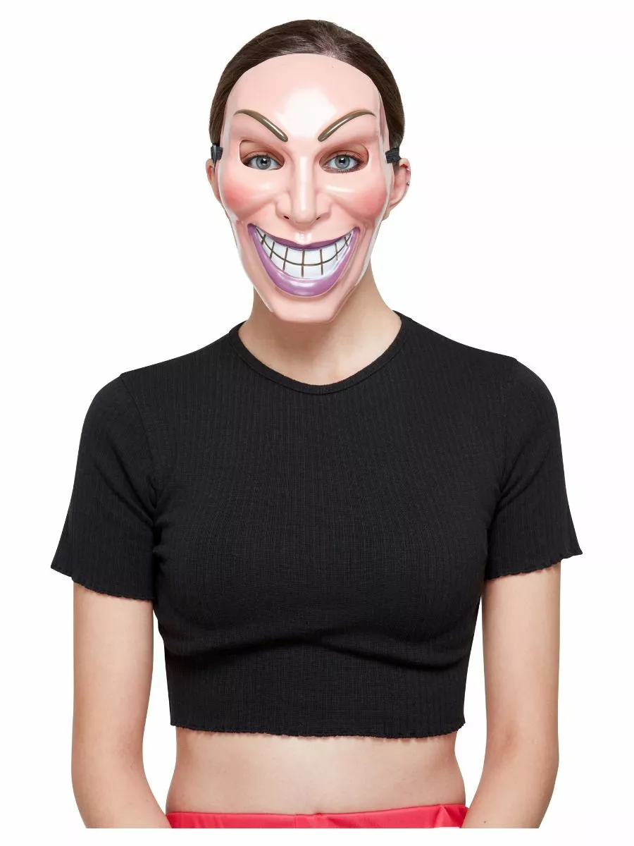 Halloween Fancy Dress Female Purge Smiler Mask. This brilliant female smiler mask is ideal for anyone looking to dress as a Scary Robber this Halloween! This brilliant flesh-coloured mask has a sinister grin and is made of plastic. It’s of course inspired by the Purge and the Strangers! A must-have this Halloween!