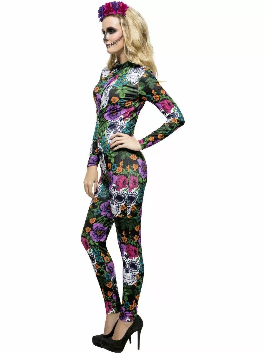 Our Adult Day of the Dead Costume features the All in One Figure hugging Catsuit with the Zip Up Front along with the Printed Skulls, Flowers and Leaves Throughout. Completing the Look is the Purple and Pink Rose Flower Headband.