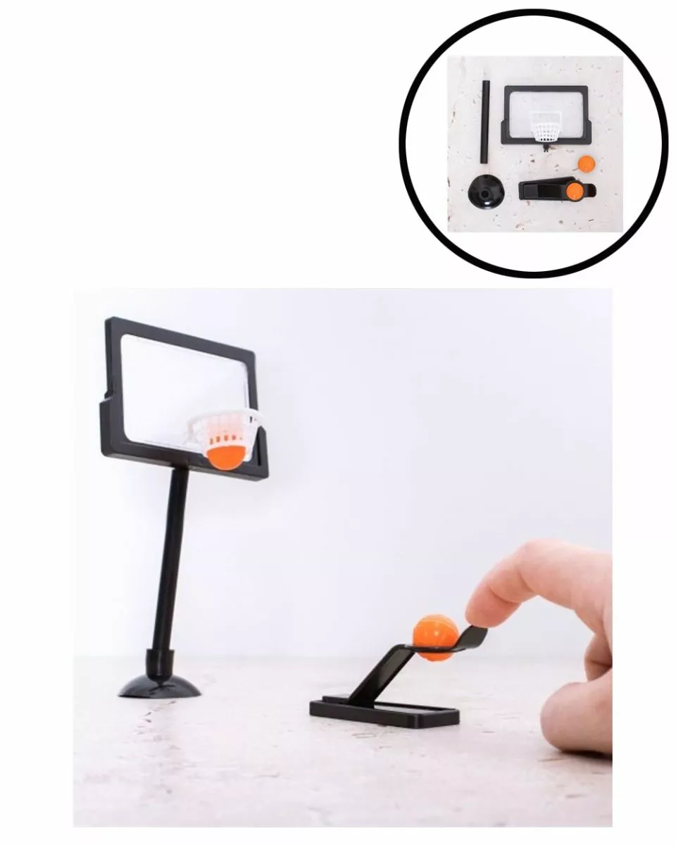 Hit those three pointers from the comfort of your desk. Position the net, add the ball to the slingshot and shoot.