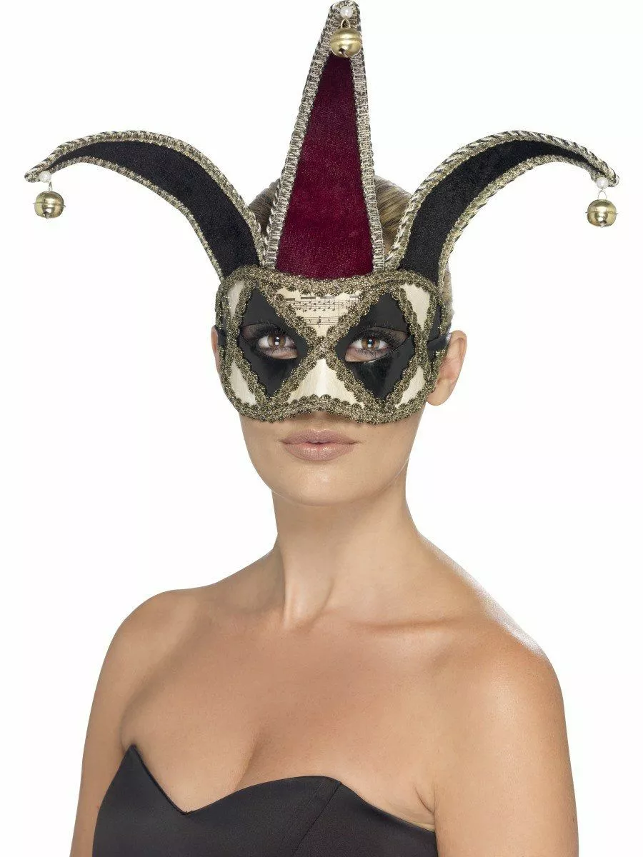 The Jester Inspired Mask features a Gold Trim with Black Diamonds around the