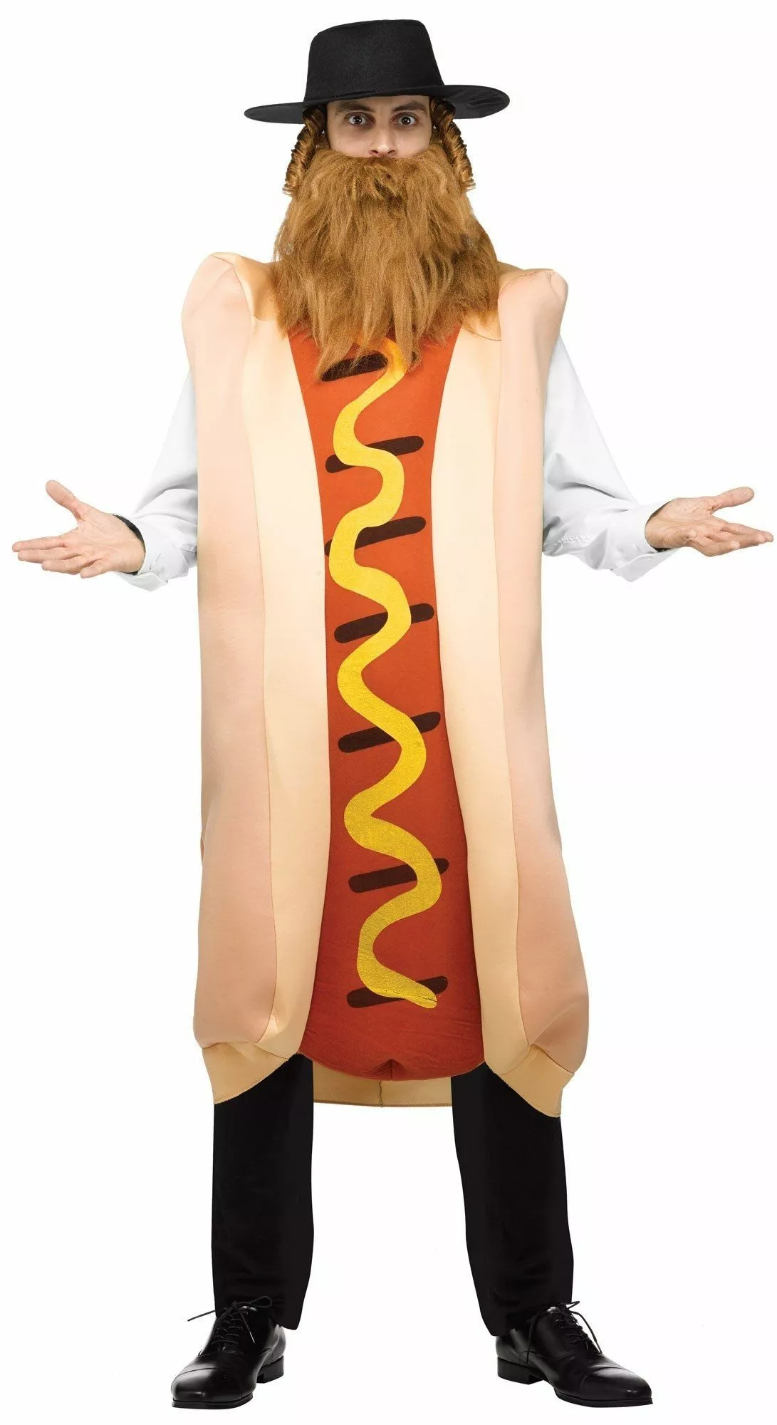 Package includes: Pull over tunic with hot dog in bun with mustard print, black hat with payis and beard.