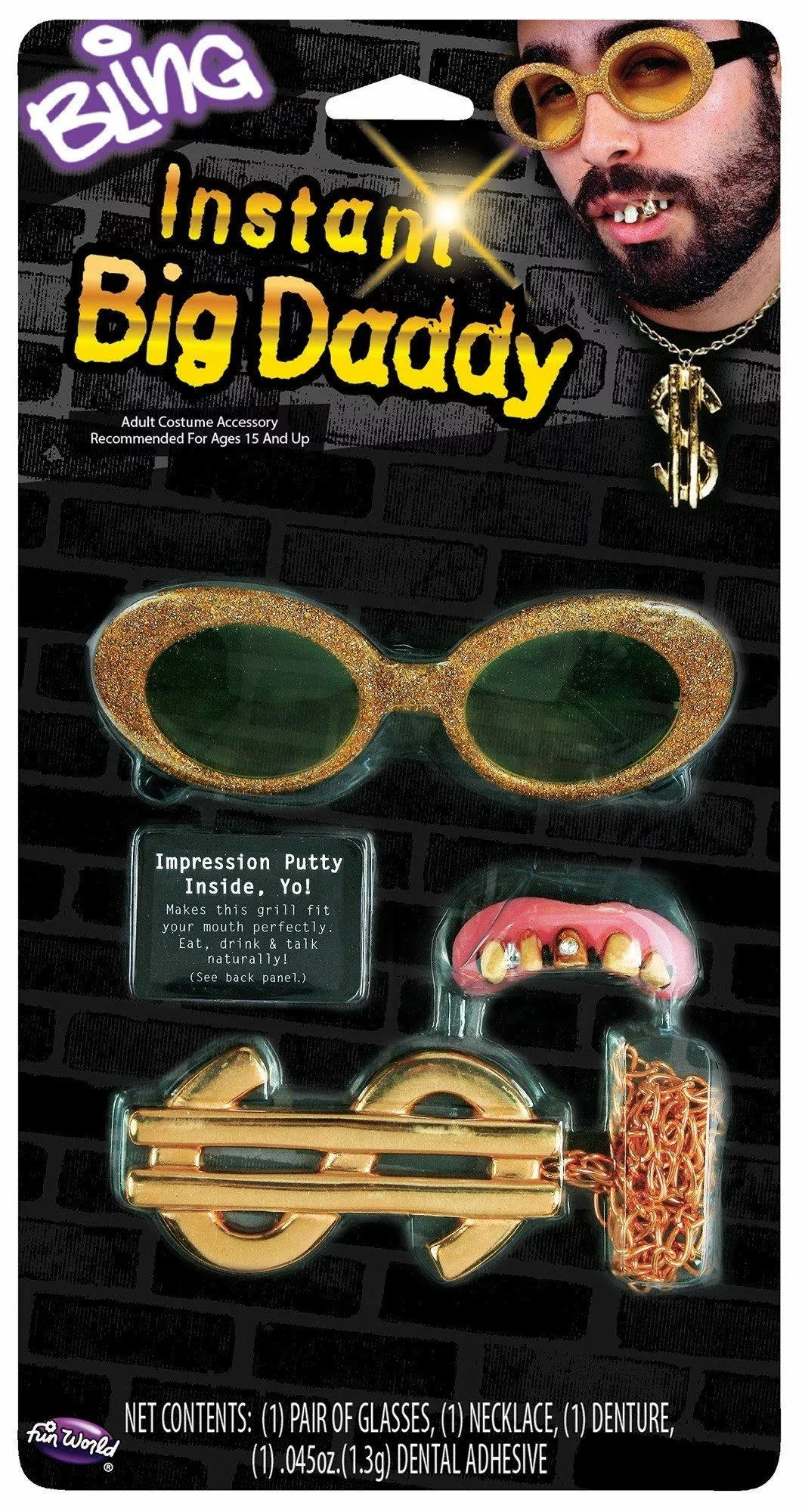 Package includes: pair of glasses, necklace, denture, dental adhesive