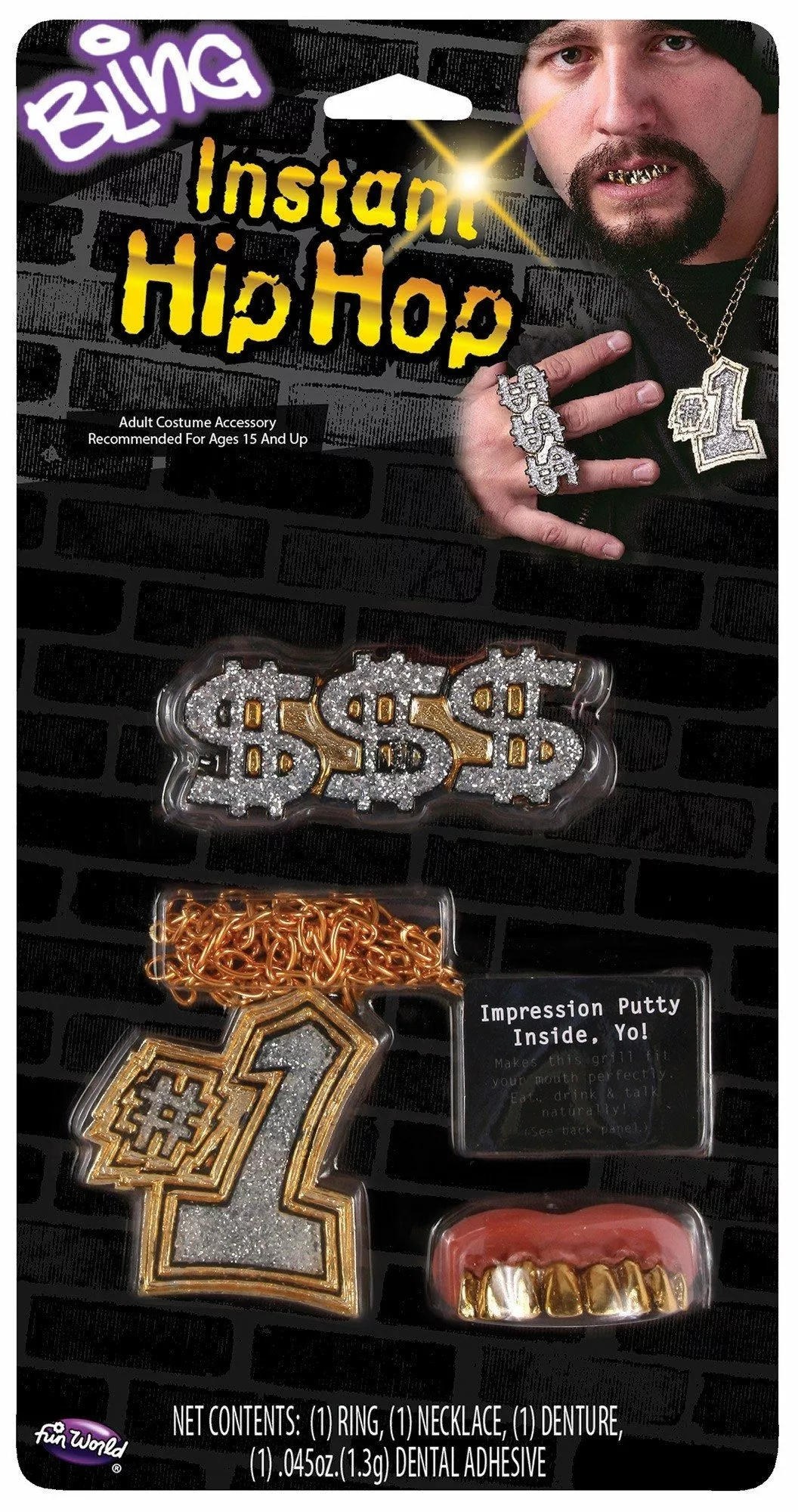 – Package includes: ring, necklace, denture, dental adhesive