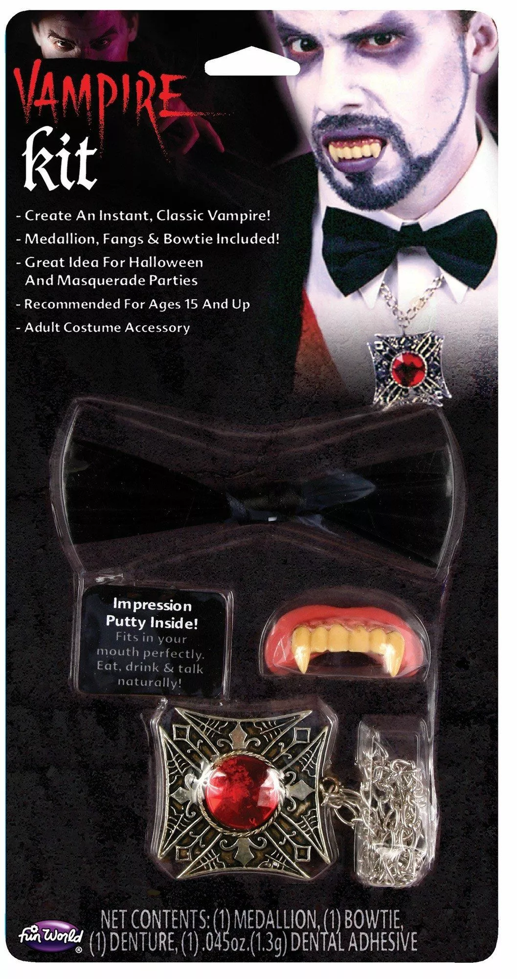 Vampire – Package includes: medallion, fangs, bow tie, dental adhesive