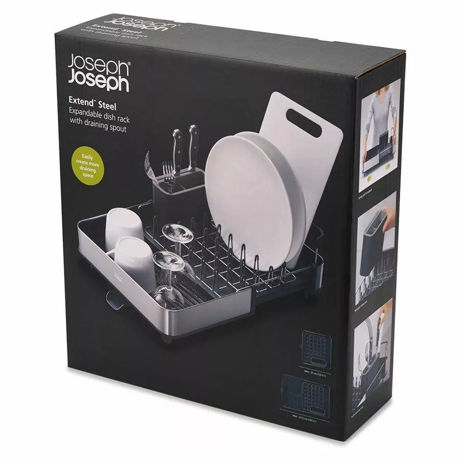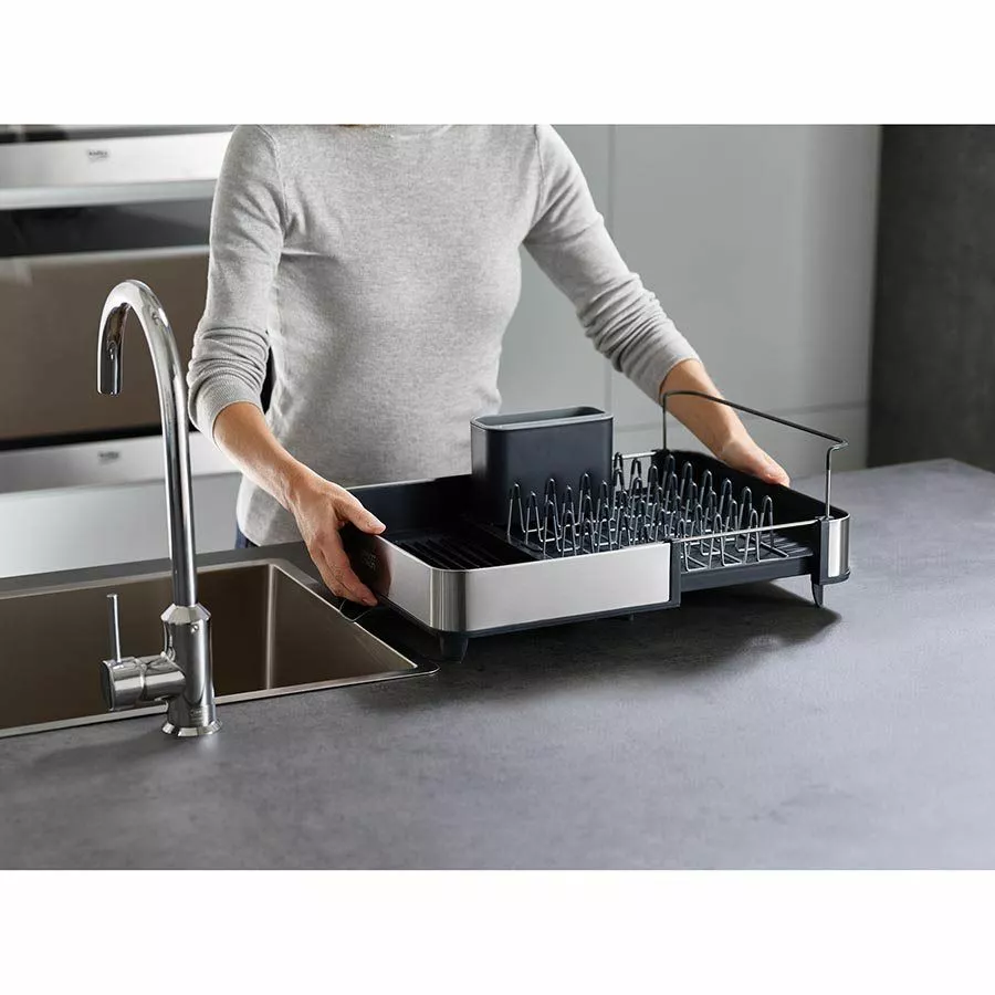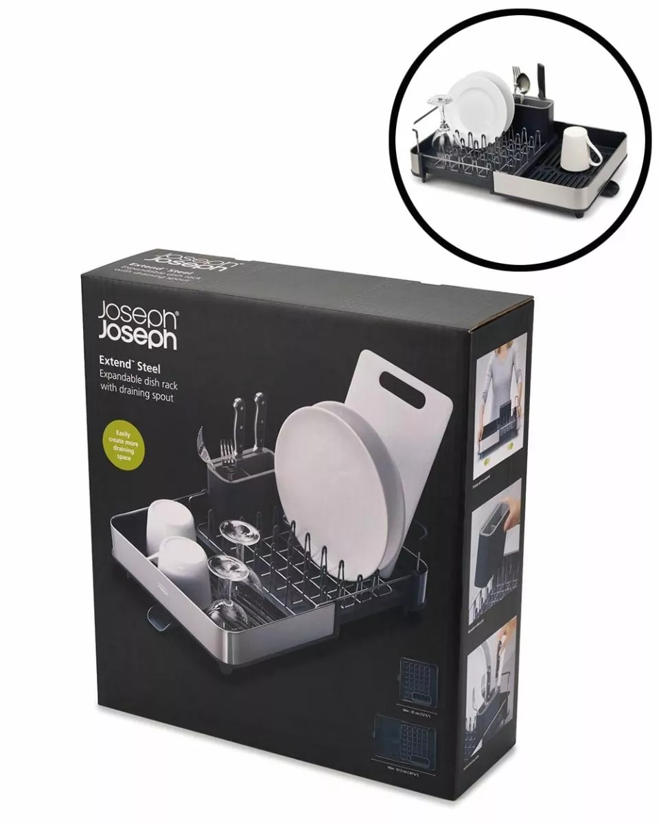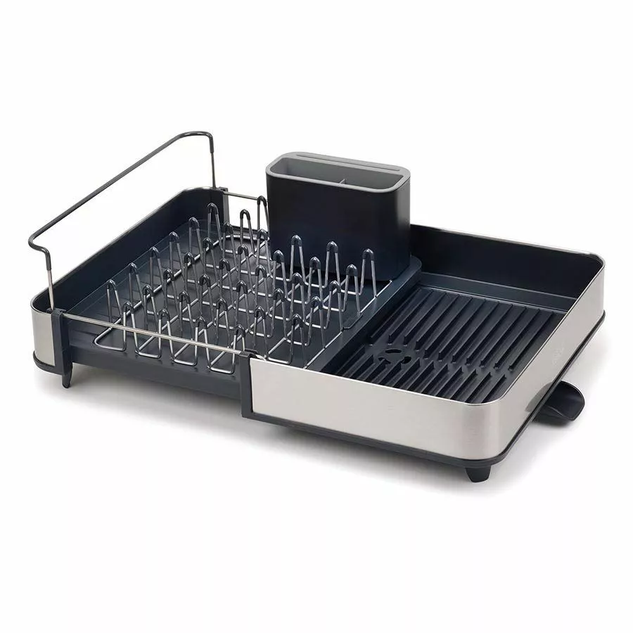 This smart dish rack features a 2-part sliding tray that allows you to easily adjust the size of your draining space when you need more room. Its coated steel prongs have non-scratch tips and can hold a variety of washing up, whilst ribs on the base help channel excess water away and prevent any from being trapped inside upturned cups or glasses. The movable cutlery drainer features slots for sharp knives and a sturdy rail at the back helps support chopping boards or larger items. Finally the spout in the base allows water to drain directly into the sink and can be set in three different positions, depending on your sink space. For added durability and a premium look, the product is finished in stainless-steel with a fingerprint-resistant coating.