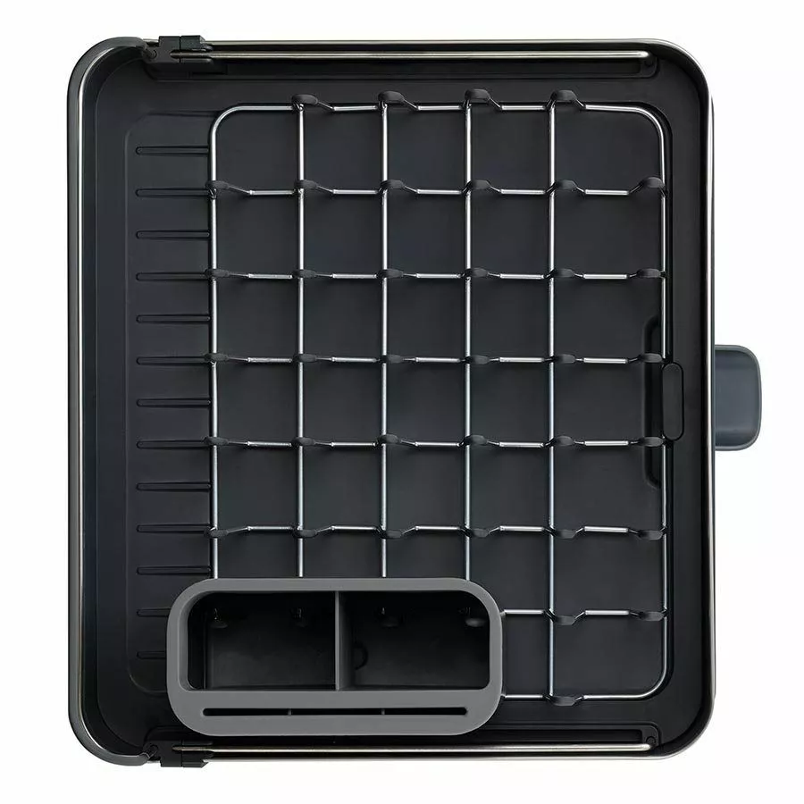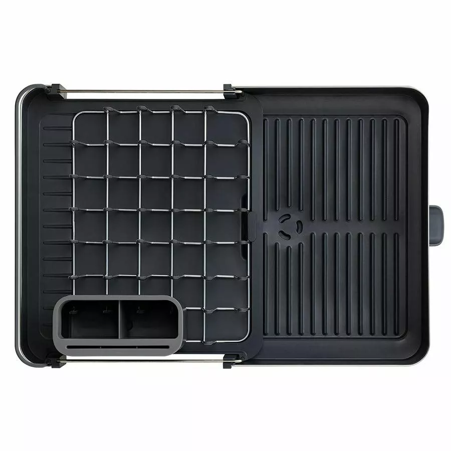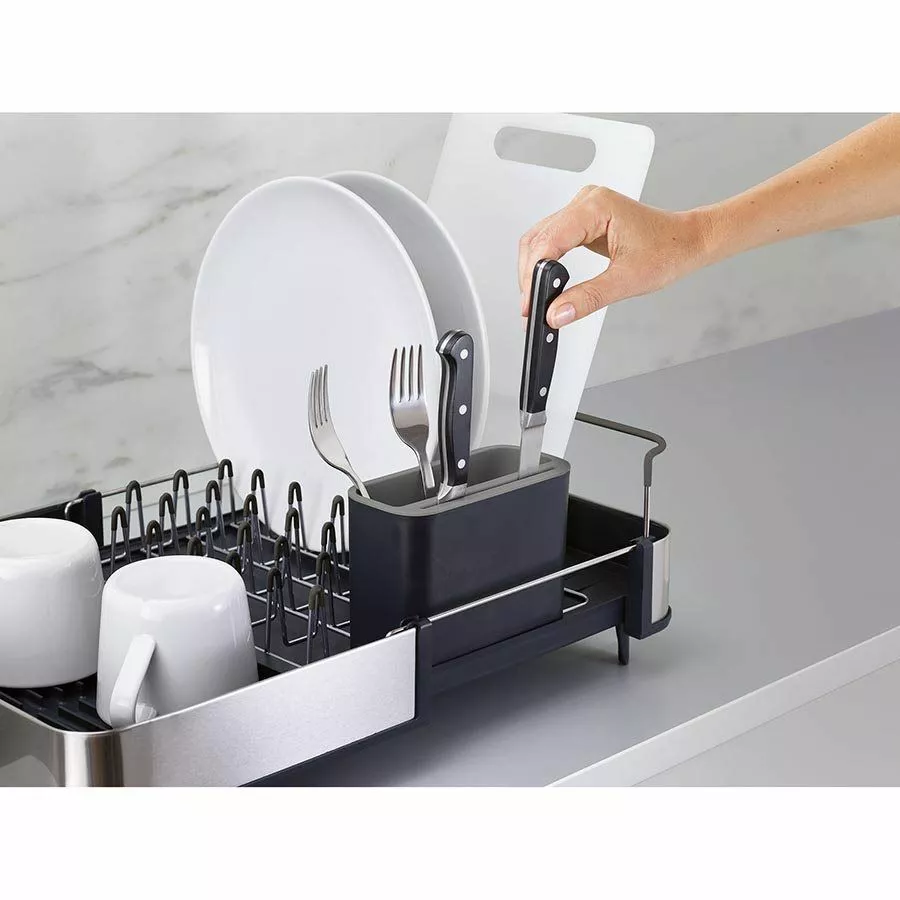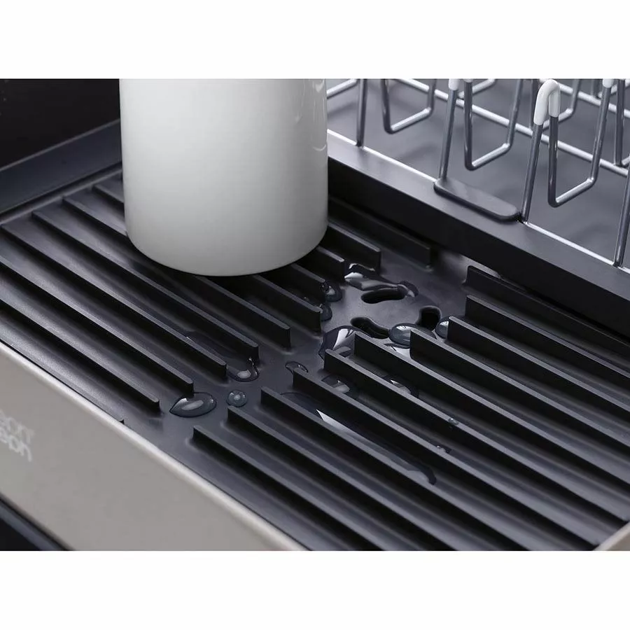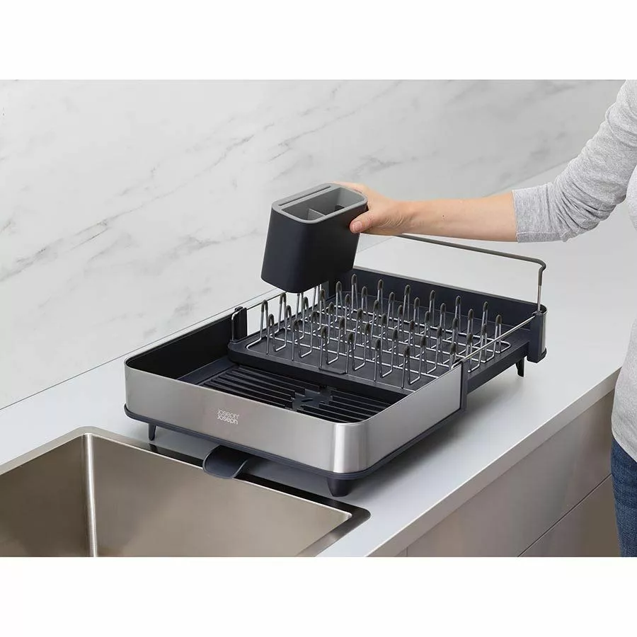 This smart dish rack features a 2-part sliding tray that allows you to easily adjust the size of your draining space when you need more room. Its coated steel prongs have non-scratch tips and can hold a variety of washing up, whilst ribs on the base help channel excess water away and prevent any from being trapped inside upturned cups or glasses. The movable cutlery drainer features slots for sharp knives and a sturdy rail at the back helps support chopping boards or larger items. Finally the spout in the base allows water to drain directly into the sink and can be set in three different positions, depending on your sink space. For added durability and a premium look, the product is finished in stainless-steel with a fingerprint-resistant coating.