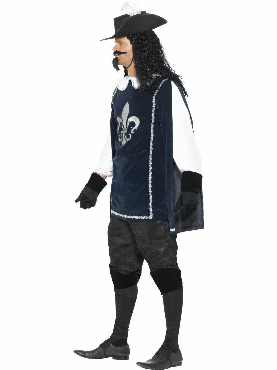 The Adult Musketeer Male Costume comes complete with the Long Royal Blue Tunic Style Top Decorated with a Silver Trim and an Emblem in the Centre of the Chest. The Top also details a Lace Trim Collar and White Sleeves with Elasticated Cuffs. Also included with the Costume is the Black Cuffed Gloves, Matching Boot Covers and 2 Piece Beard. Completing the Historical Outfit is the Hat with a Bent Brim on One Size and an attached White Feather.