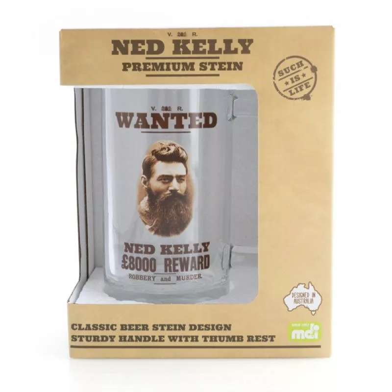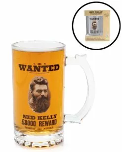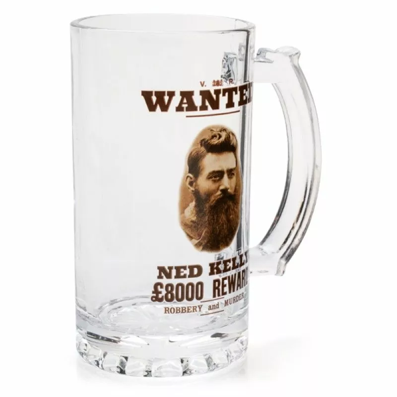 Sturdy glass beer stein featuring a decal of Ned Kelly’s wanted poster