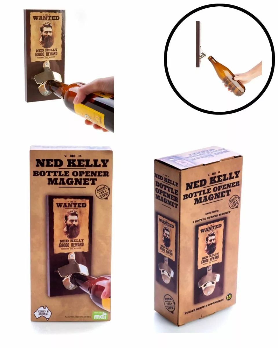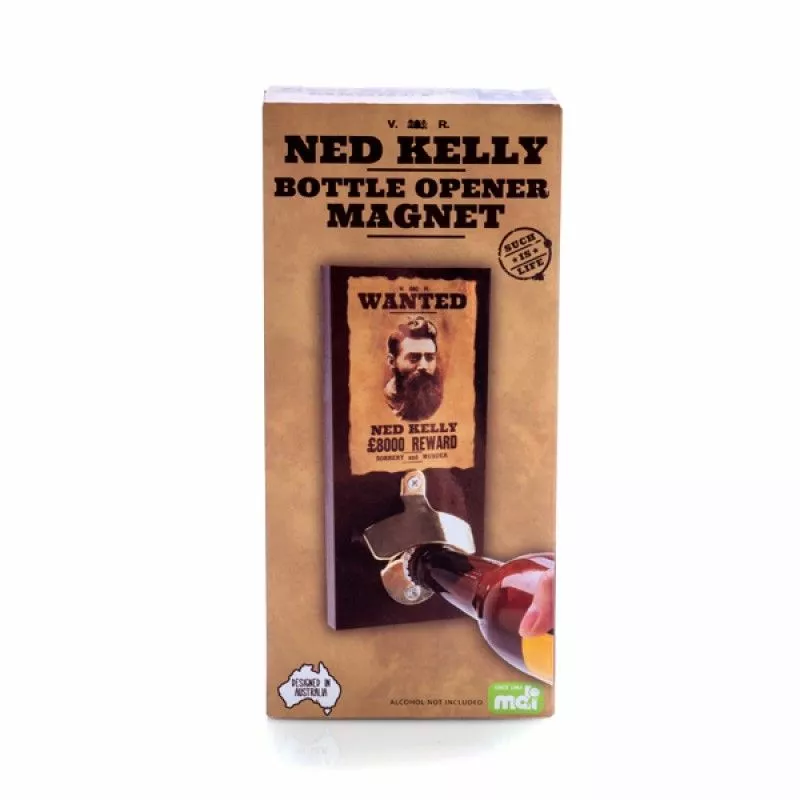 Bottle opener magnet featuring Ned Kelly’s wanted poster