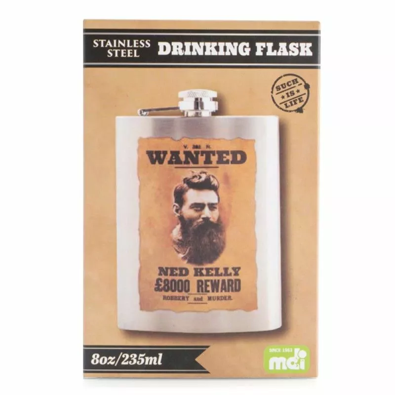 Epic Australiana flask features a decal of Ned Kelly’s wanted poster