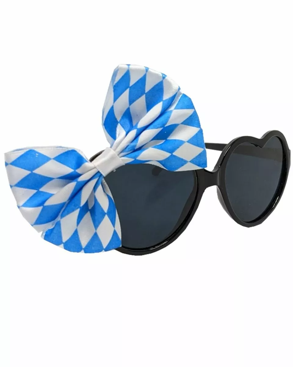 This fun gray hat is a great accessory to add to your costume for Oktoberfest. Featuring Oktoberfest glasses with black heart-shaped frames and dark lenses. Glasses have a blue and white bow attached above one of the eyes.