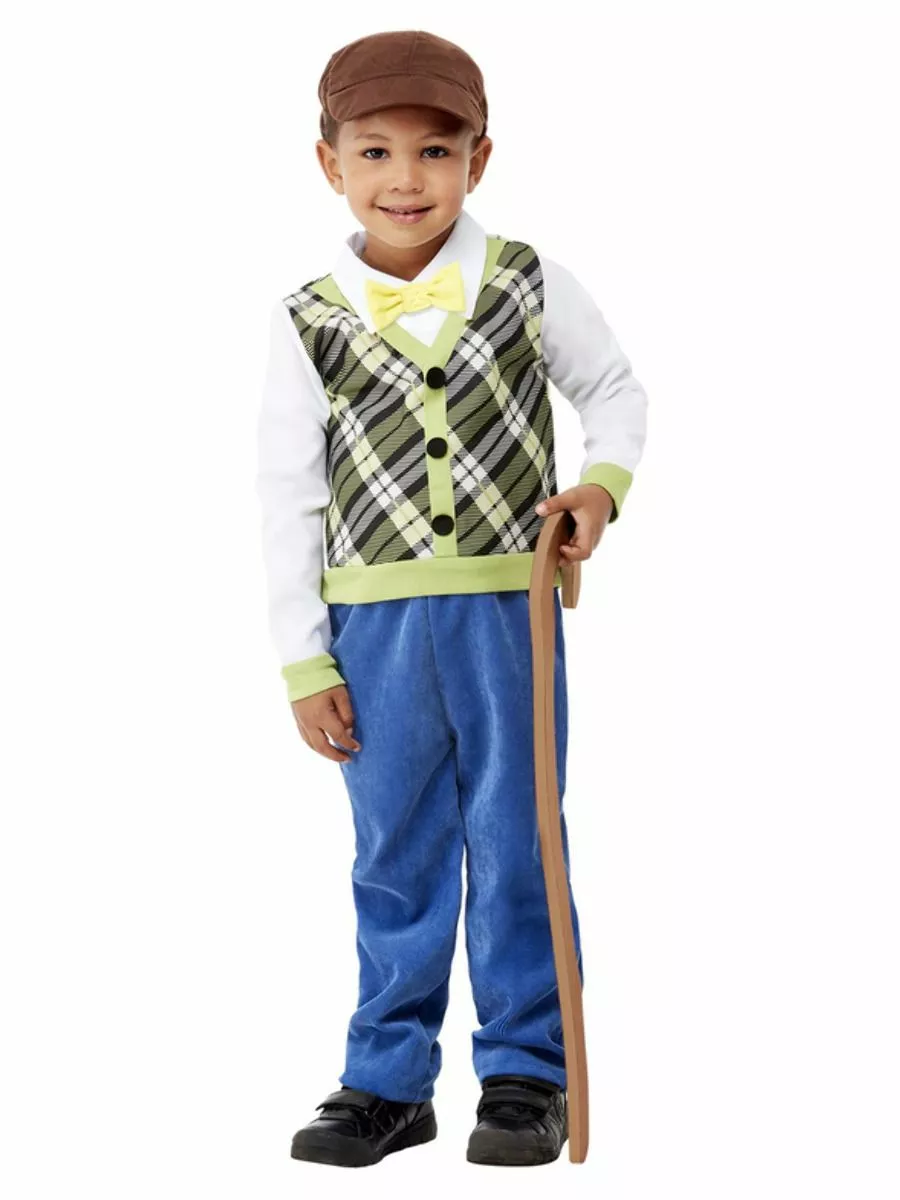 This brilliant Kid’s Old Man Toddler Costume comes complete with a Green and White, Tartan Print Top with Mock Waistcoat Design, attached White Collar with Green Bowtie, Blue Trousers, Brown Flat Cap Hat and a Brown Cane/ Walking Stick to finish off the look.