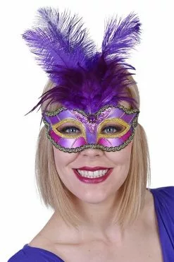 Pieta Eye Mask features half mask with bold colours, delicate trim, center stone embellishment and bold black or purple feathers. Add mystery and intrigue with this gorgeous masquerade mask!
