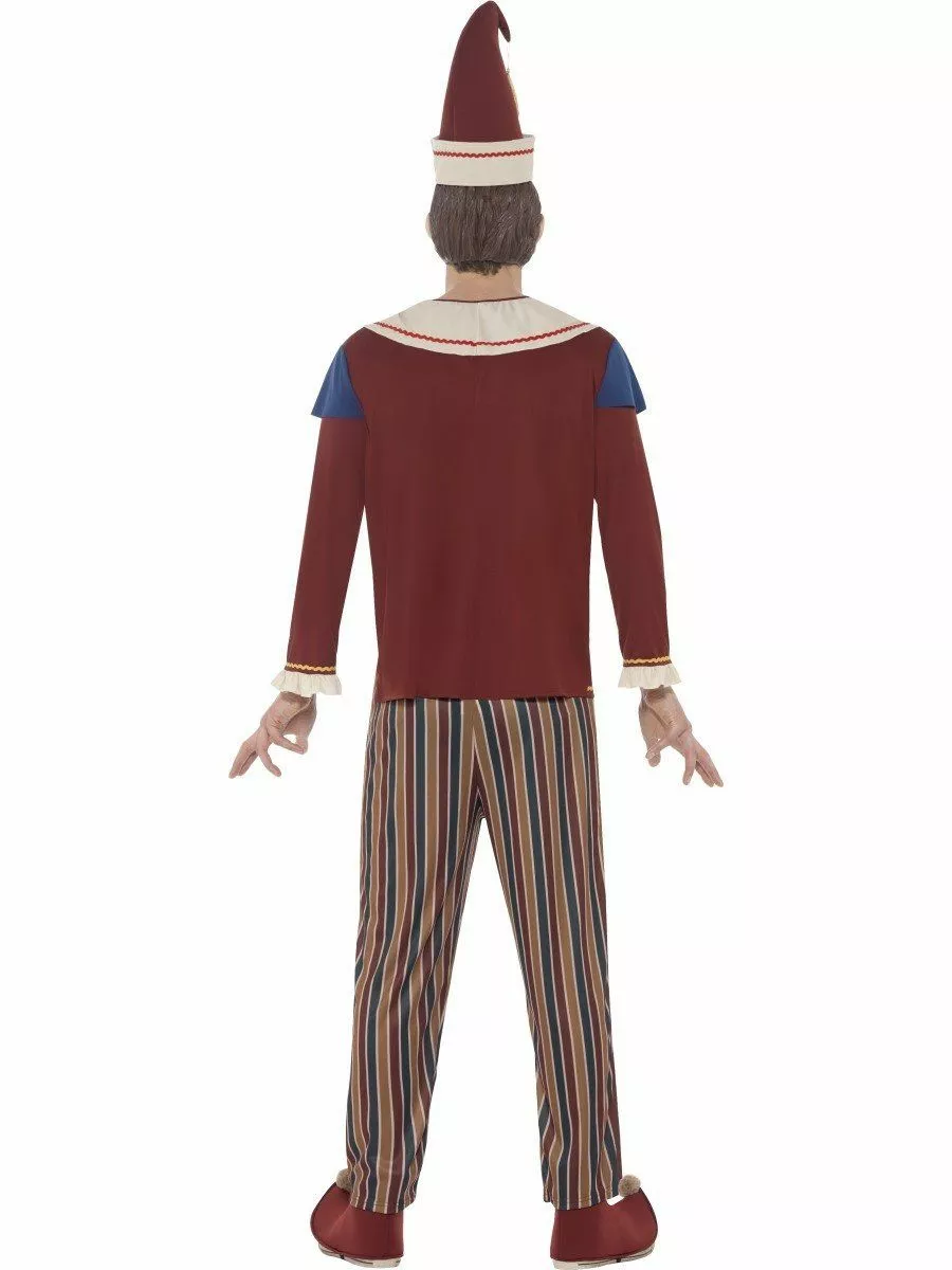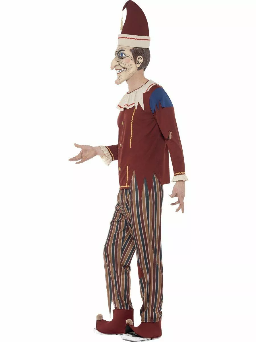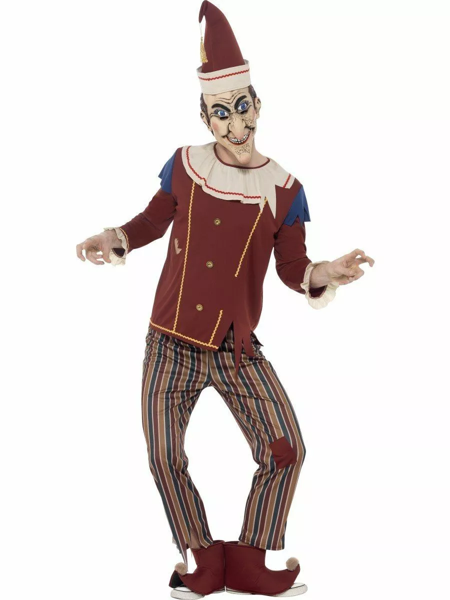 The Costume comes complete with the Brown Tattered Long Sleeved Top with the Frilled Sleeves, Collar and Buttons along with the Yellow and Red Zig Zag Patterning and Ripped Blue Shoulders. Also included is the Multicoloured Striped Trousers with an Elastic Waist. Completing the Look is the Red Pointed Hat with attached Gold Tassel, Curled Up Boot Covers with Pom Poms and Creepy Latex Character Front Face Mask.