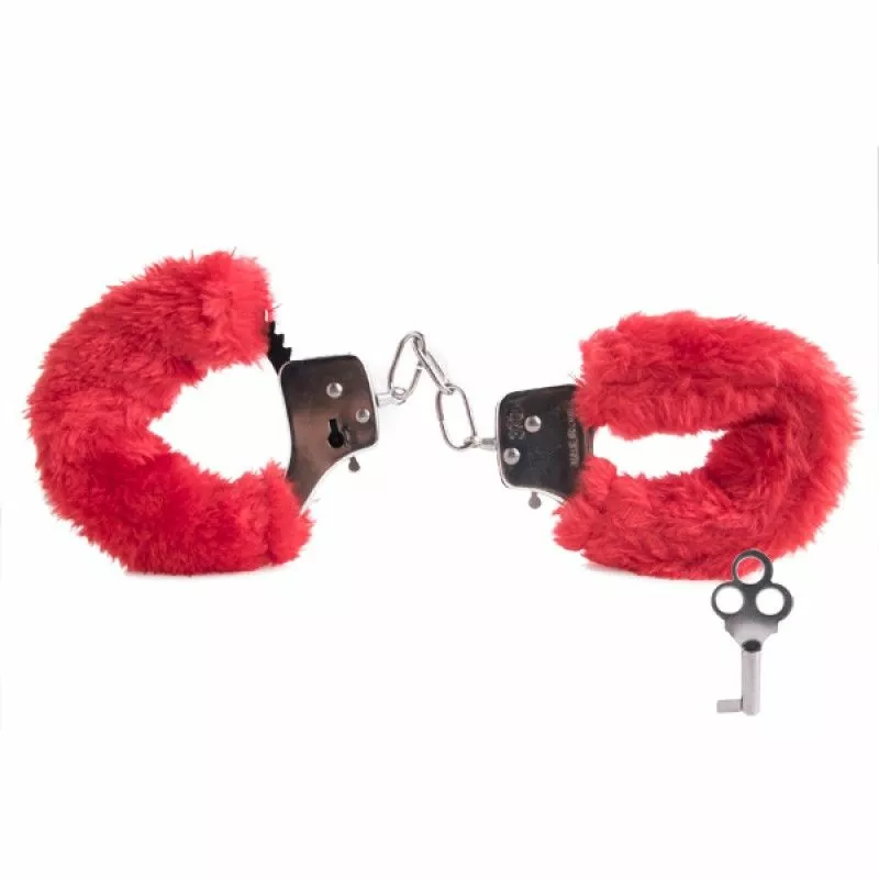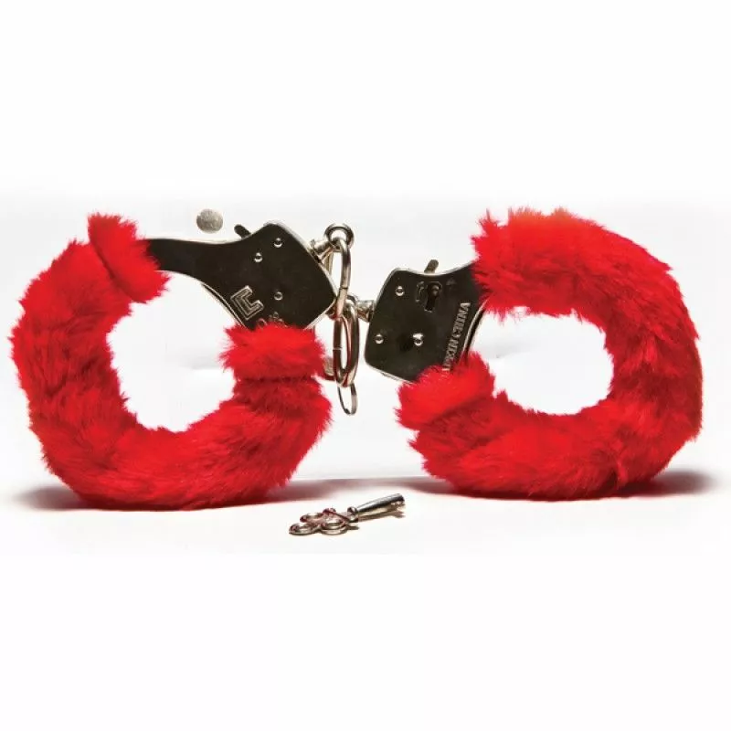 Novelty handcuffs covered in faux red coloured fur