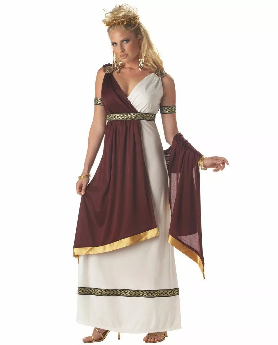 Rome was filled with incredible women and here’s your chance to portray some of the most important figures in ancient history! Whichever you choose, you’ll look dazzling in this white dress with attached maroon drape, gold medallions and matching armbands.
