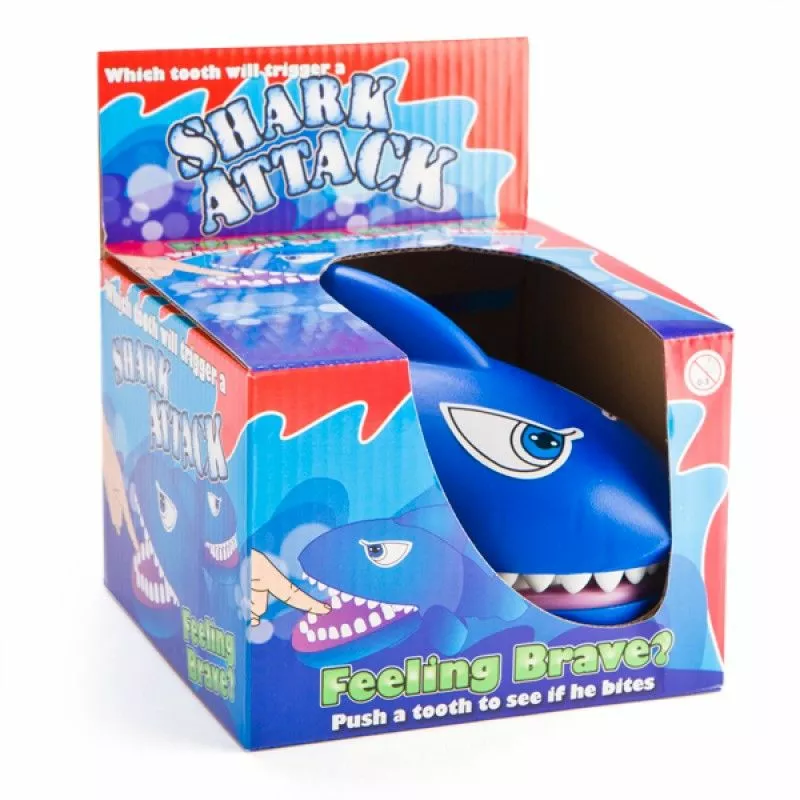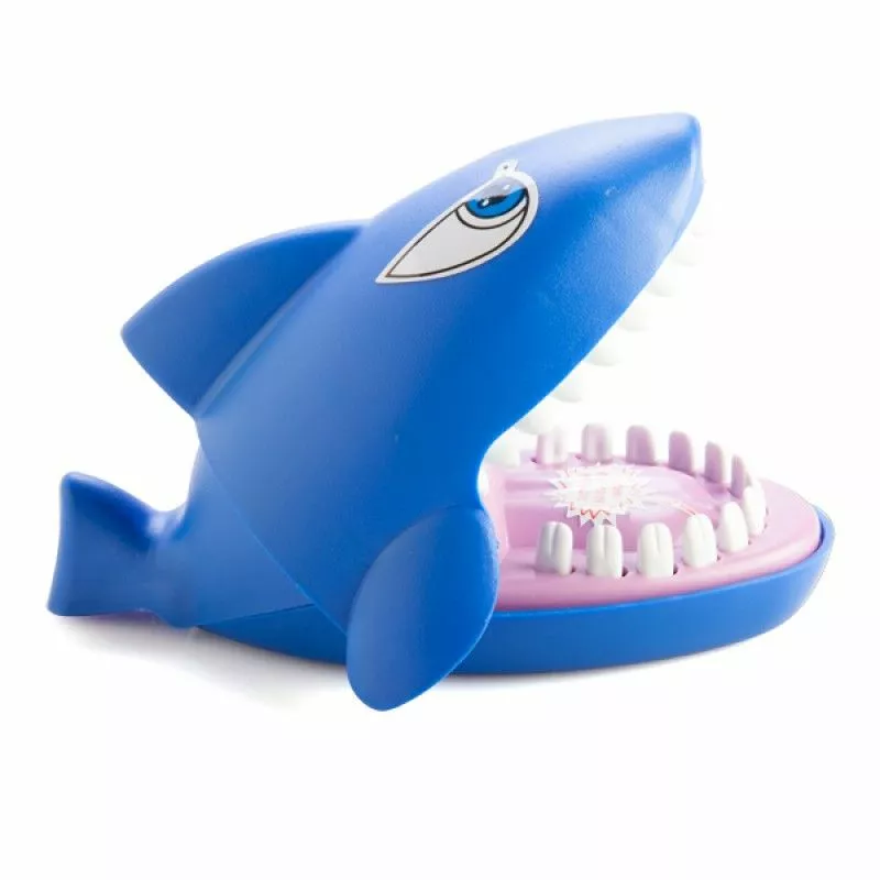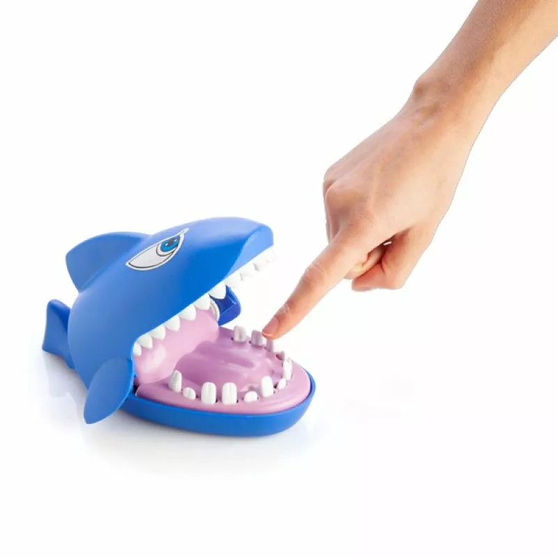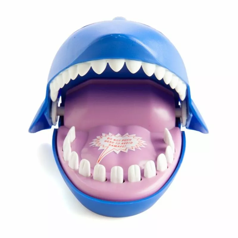 Fun game of risk and luck, one tooth will clamp the jaws down on a players hand when it’s pressed