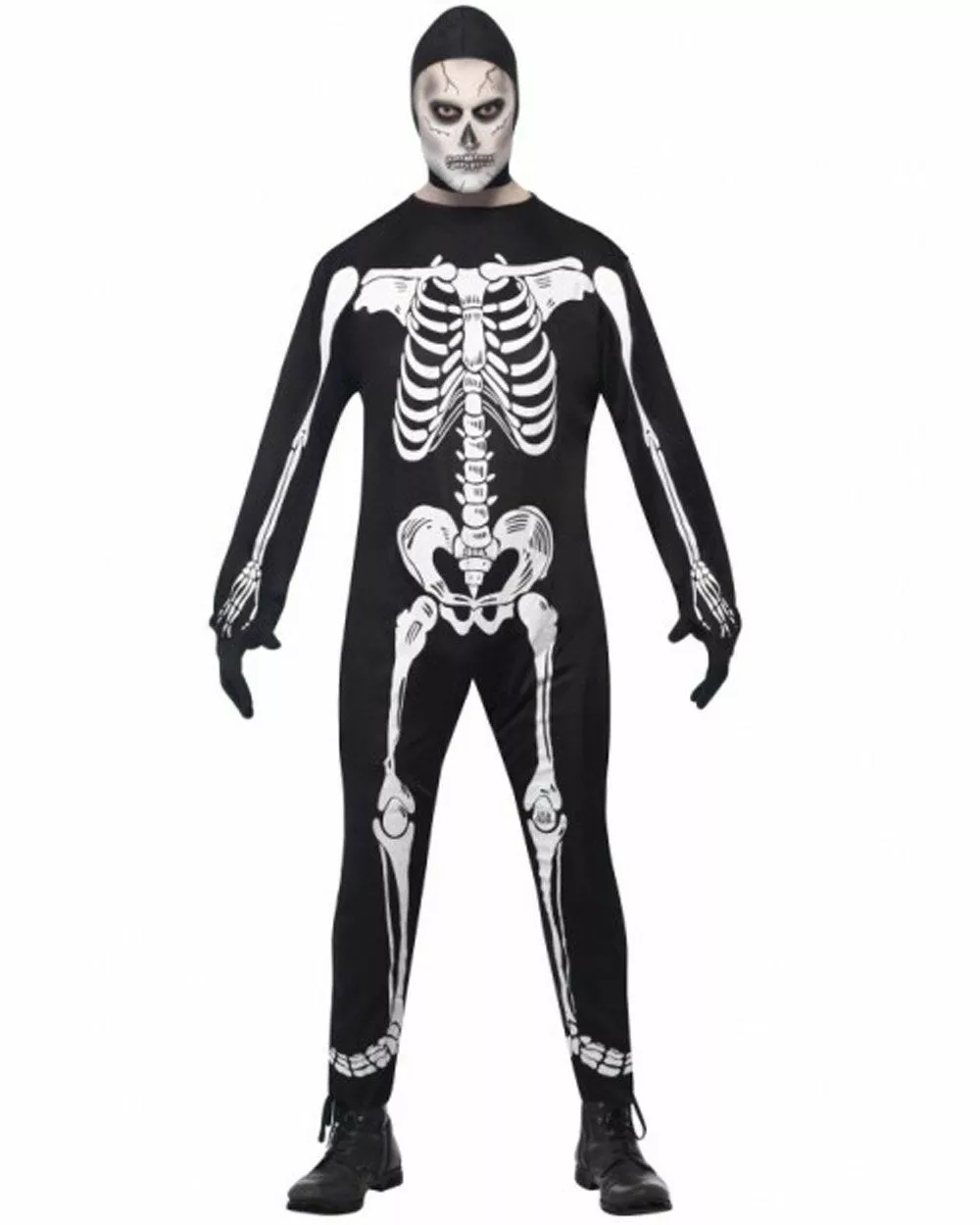Our Halloween skeleton costume includes black jumpsuit with printed skeleton bones, black hood and gloves.