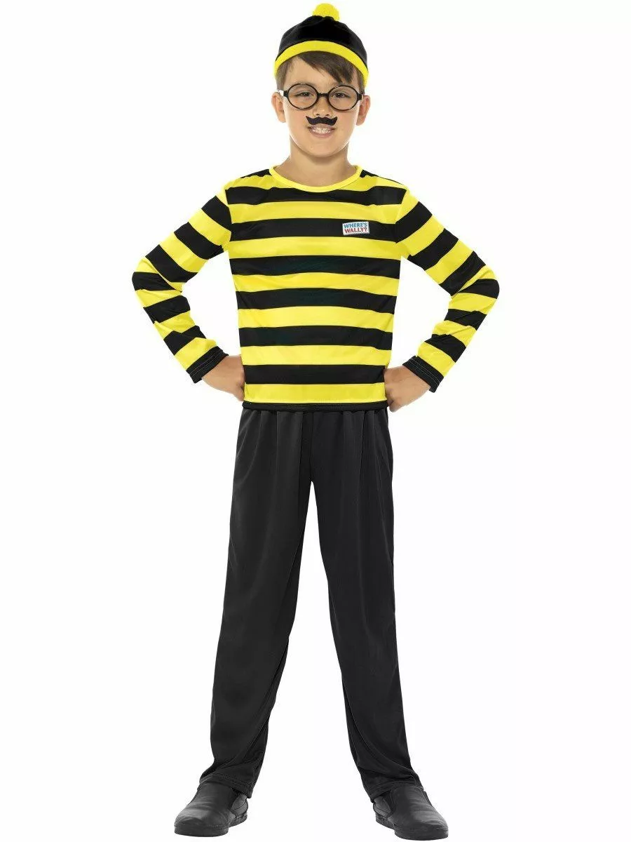 The Costume comes complete with the Yellow and Black Striped Long Sleeved Top and Black Elasticated Trousers. Completing the Look is the Round Framed Glasses and Mini Moustache.