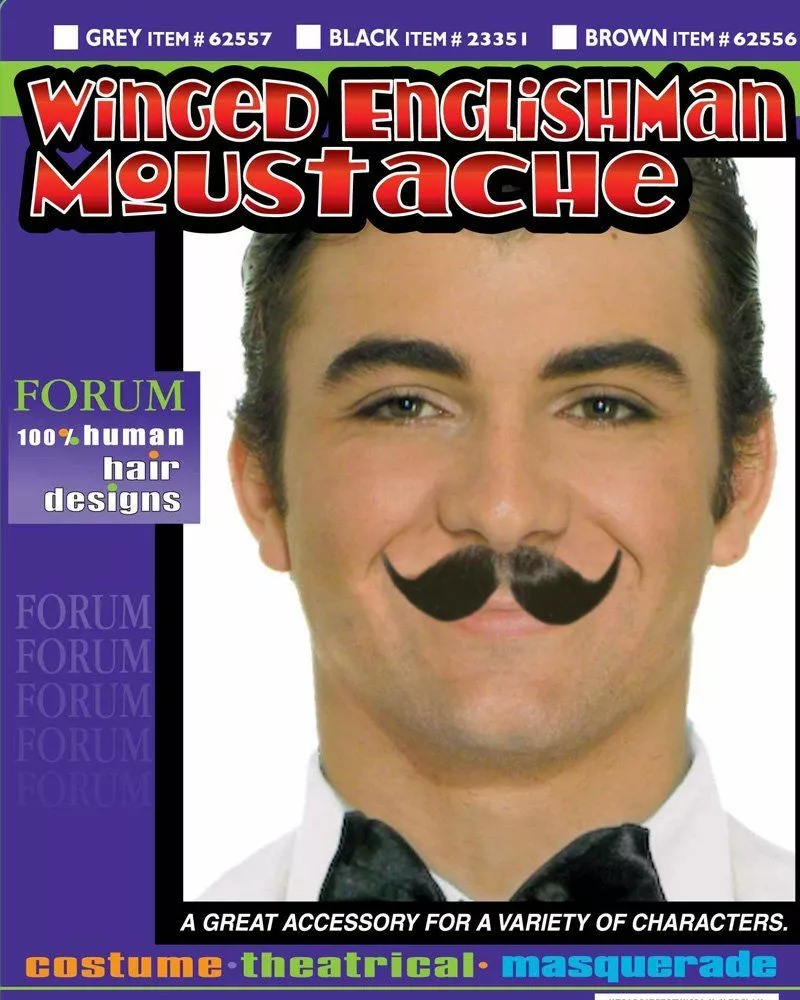The winged Englishman moustache is a must have to add the finishing touches to any old time bar tender Halloween costume or is great to wear just for fun.